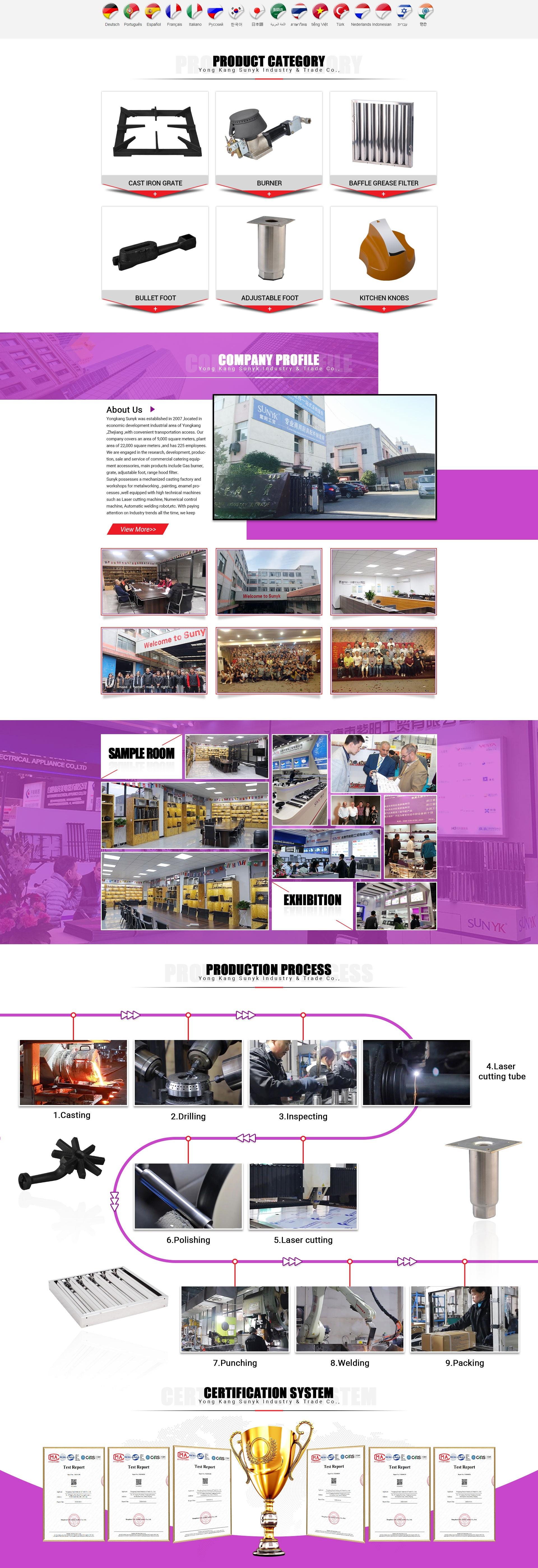 Yongkang Sunyk was established in 2007 ,located ineconomic development industrial area of YongkangZhejiang ,with convenient transportation access. Ourcompany covers an area of 9,000 square meters, plantarea of 22,000 square meters ,and has 225 employees.We are engaged in the research, development, produc-tion, sale and service of commercial catering equipment accessories, main products include Gas burner,grate, adjustable foot, range hood filter.Sunyk possesses a mechanized casting factory andworkshops for metalworking , painting, enamel pro-cesses ,well equipped with high technical machinessuch as Laser cutting machine, Numerical controlmachine, Automatic welding robot,etc. With payingattention on Industry trends all the time, we keep